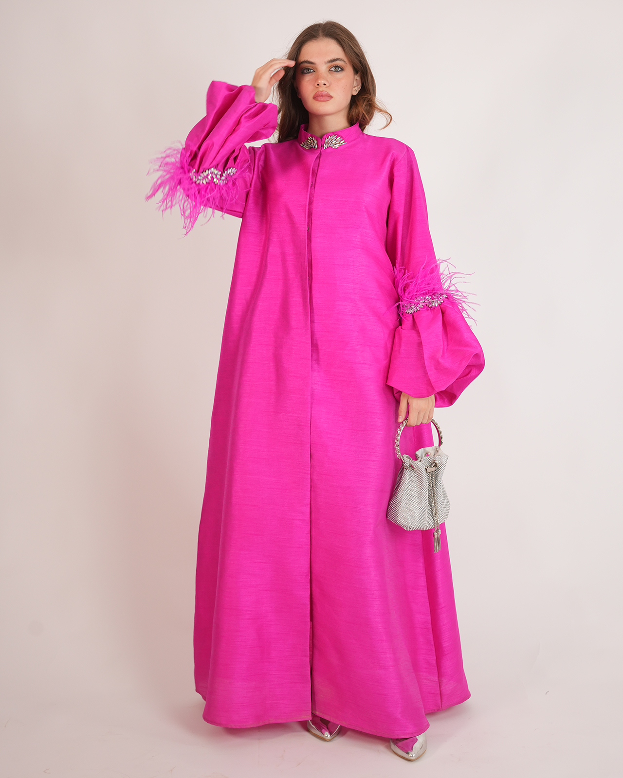 تجسد هذه العباية مزيجًا متناغمًا بين التراث والحداثة، مستوحاة من زهرة الجهنمية الفوشية التي تزين أرجاء عمّان بجمالها البهيج. استخدم في تصميمها قماش التفتا الفاخر، وزُيّنت بكريستالات شواروفسكي اللامعة، مع لمسة من الريش الناعم على الأكمام، مما يضفي عليها فخامة ورقيًا. تتميز بقصتها الواسعة التي تعكس الاحتشام التقليدي، مع حزام من نفس القماش يُبرز جمال الخصر ويمنحها لمسة أنثوية جريئة. هذه العباية تعبر عن توازن مثالي بين الاحتشام، الأنوثة، والجرأة، لتكون خيارًا مثاليًا للمرأة العصرية التي تبحث عن التميز.