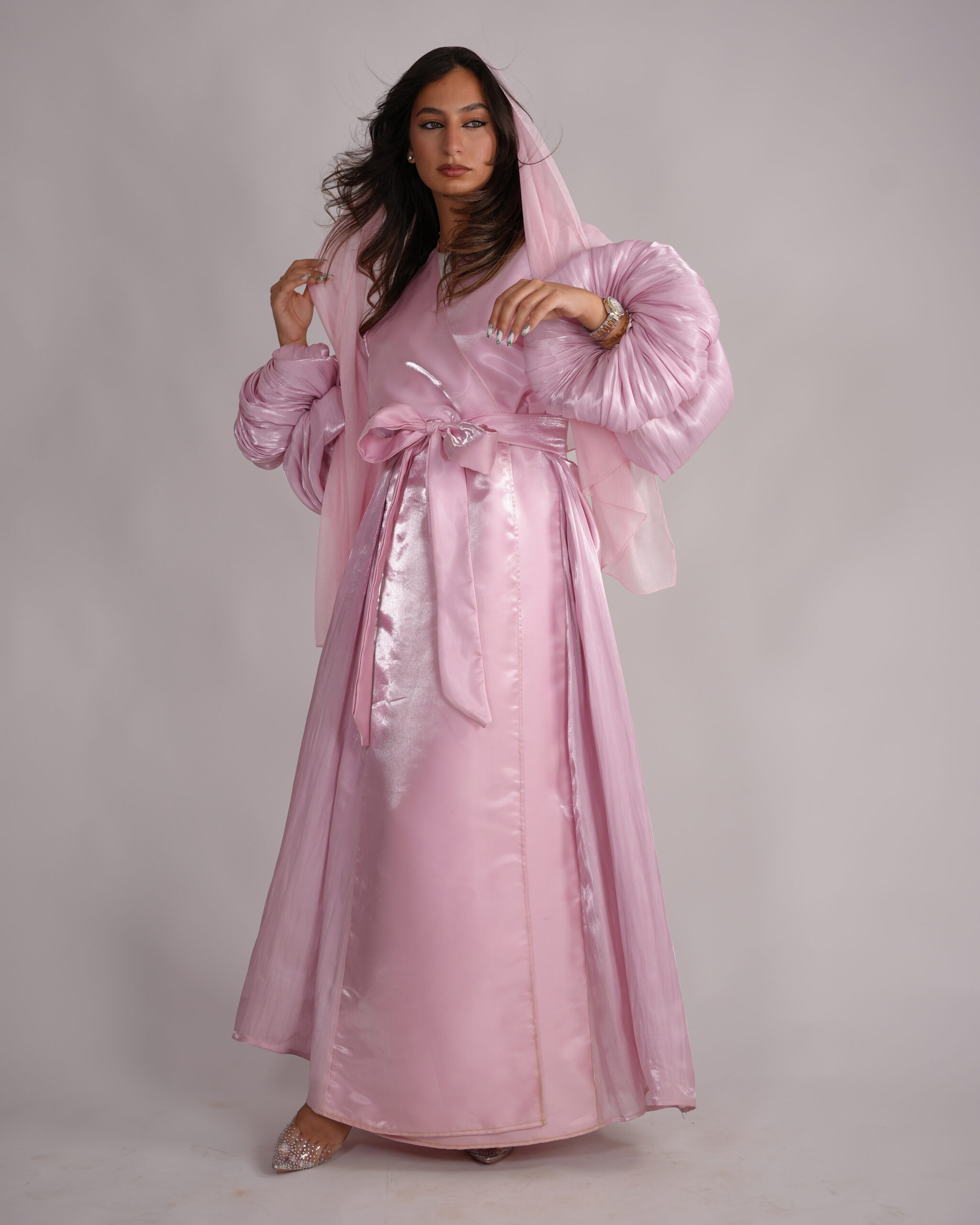 تجسد هذه العباية قمة الأنوثة والرقة، مصنوعة من قماش الساتان الكريستالي الفاخر باللون الزهري الفاتح، ومزينة بطبقة شفافة من الأورجانزا تضفي عليها لمسة ساحرة. تتميز بأكمام منتفخة ومتهدلة، تمنحها انسيابية وحركة جذابة، مع الحفاظ على الطابع التقليدي للعباءة. هذا التصميم الأنيق يناسب المرأة التي تسعى لإبراز أنوثتها بأسلوب راقٍ ومتميز.