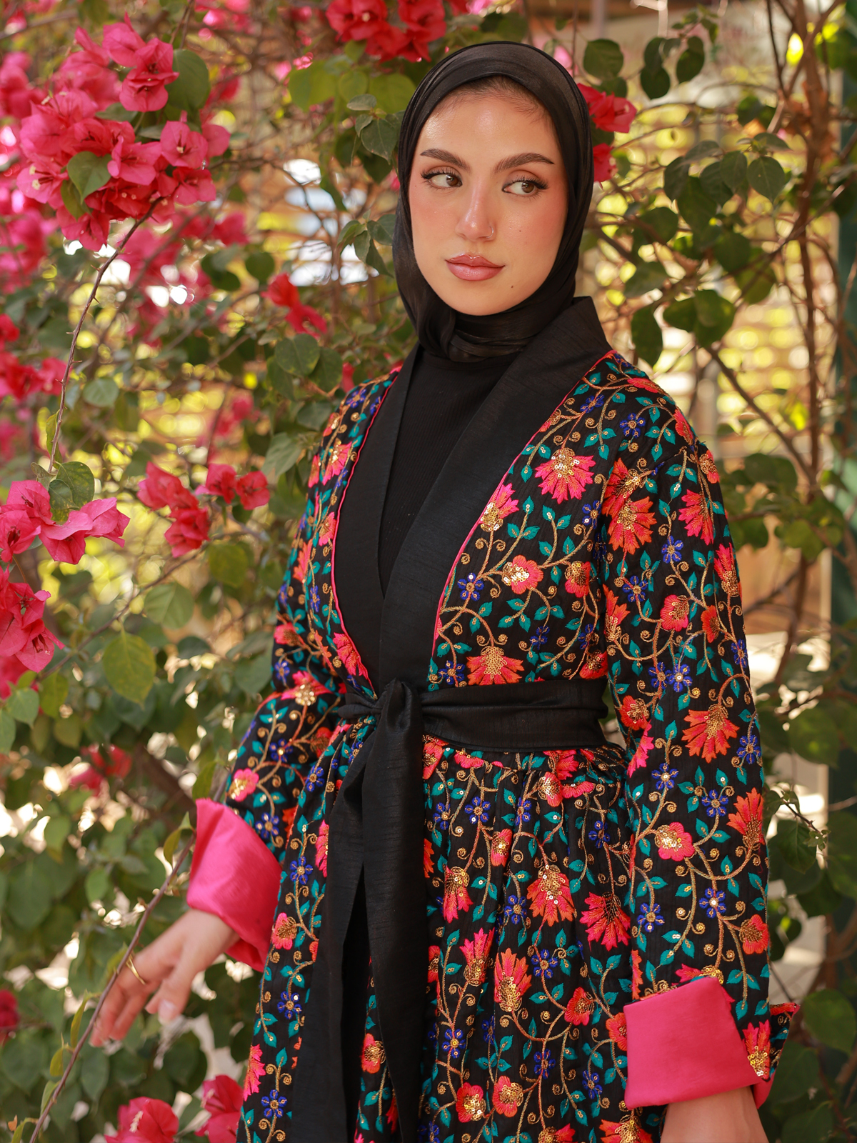 نفقد الاحساس بالحياة عندما نقد الدهشة , القماش التفتا المطرز بأزهار الربيع المتداخلة بألوانها الجريئة تتخللها تقصيبات من الذهب و بعض القطع اللامعة يحيط بها إطار أسود رزين و حزام يجمعها كضمة ورد في باقة مذهلة, لن نفشل أبدا بأن تدخل الدهشة الى لب ناظرها